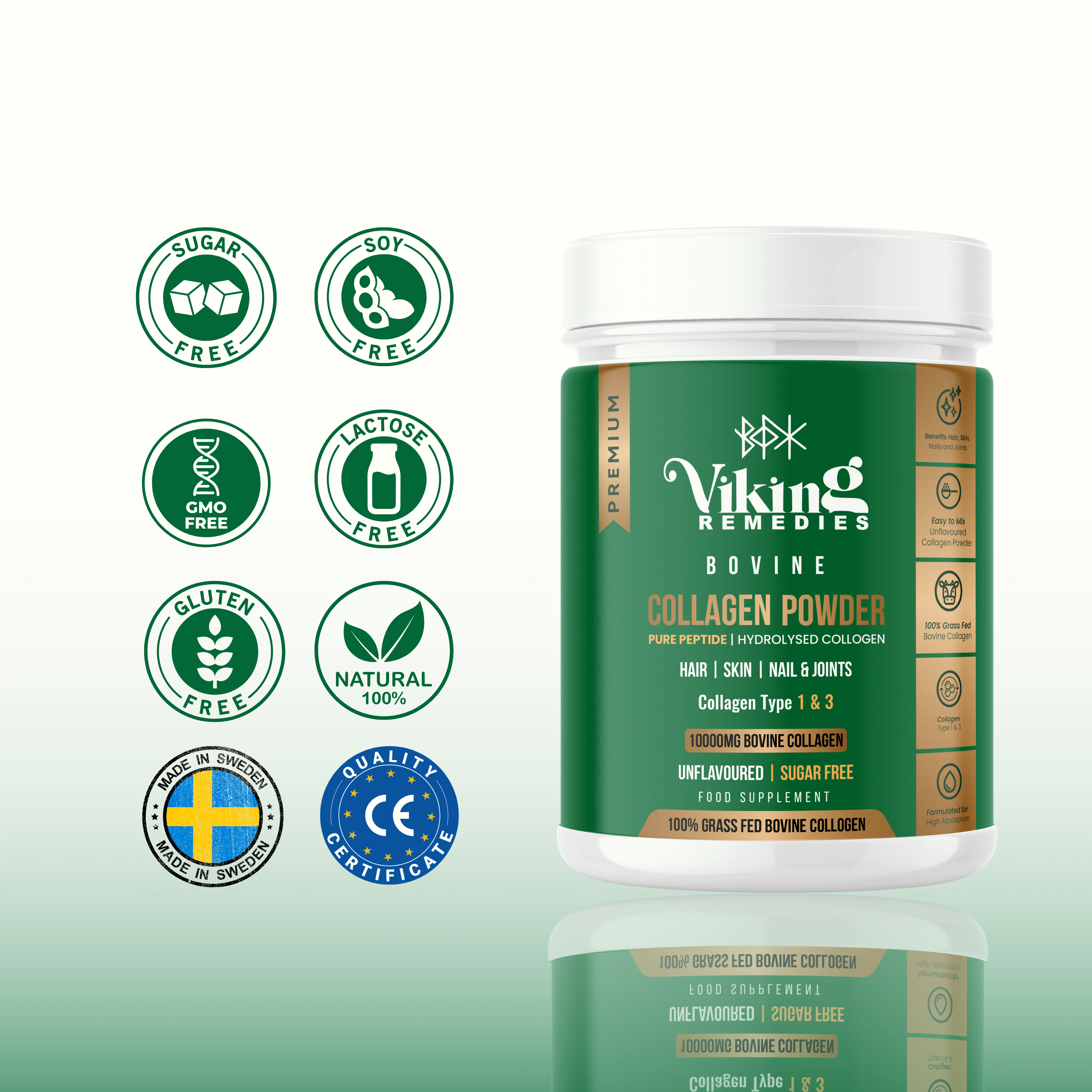 Collagen is the building block of your skin, joints, and connective tissues, providing strength, elasticity, and youthful vitality. As we age, our body's natural collagen production declines, leading to wrinkles, sagging skin, and joint discomfort. Viking Remedies Bovine Collagen is designed to replenish your body's collagen stores and help you turn back the clock. Our premium collagen peptides are easily absorbed, working to promote firmer, smoother skin by reducing the appearance of fine lines and wrinkles, while improving skin elasticity. It also supports joint health by strengthening cartilage, improving flexibility, and easing joint discomfort. And that's not all – it can even boost hair and nail growth for a healthier, more vibrant appearance. Rediscover your youthful glow and support your body's natural vitality with Viking Remedies Bovine Collagen.