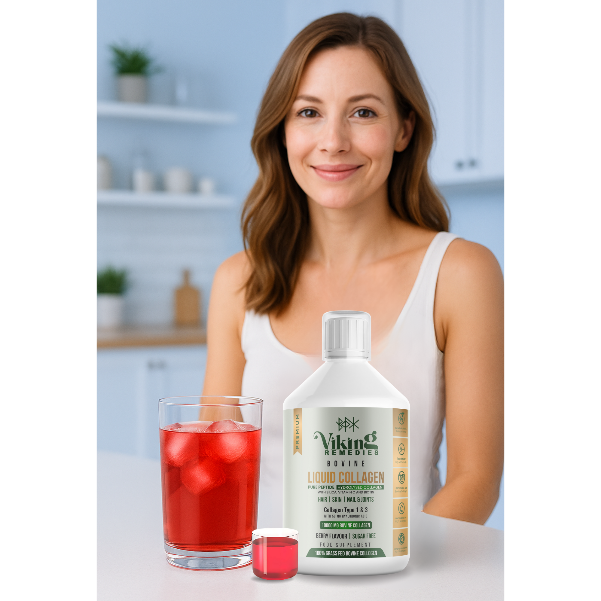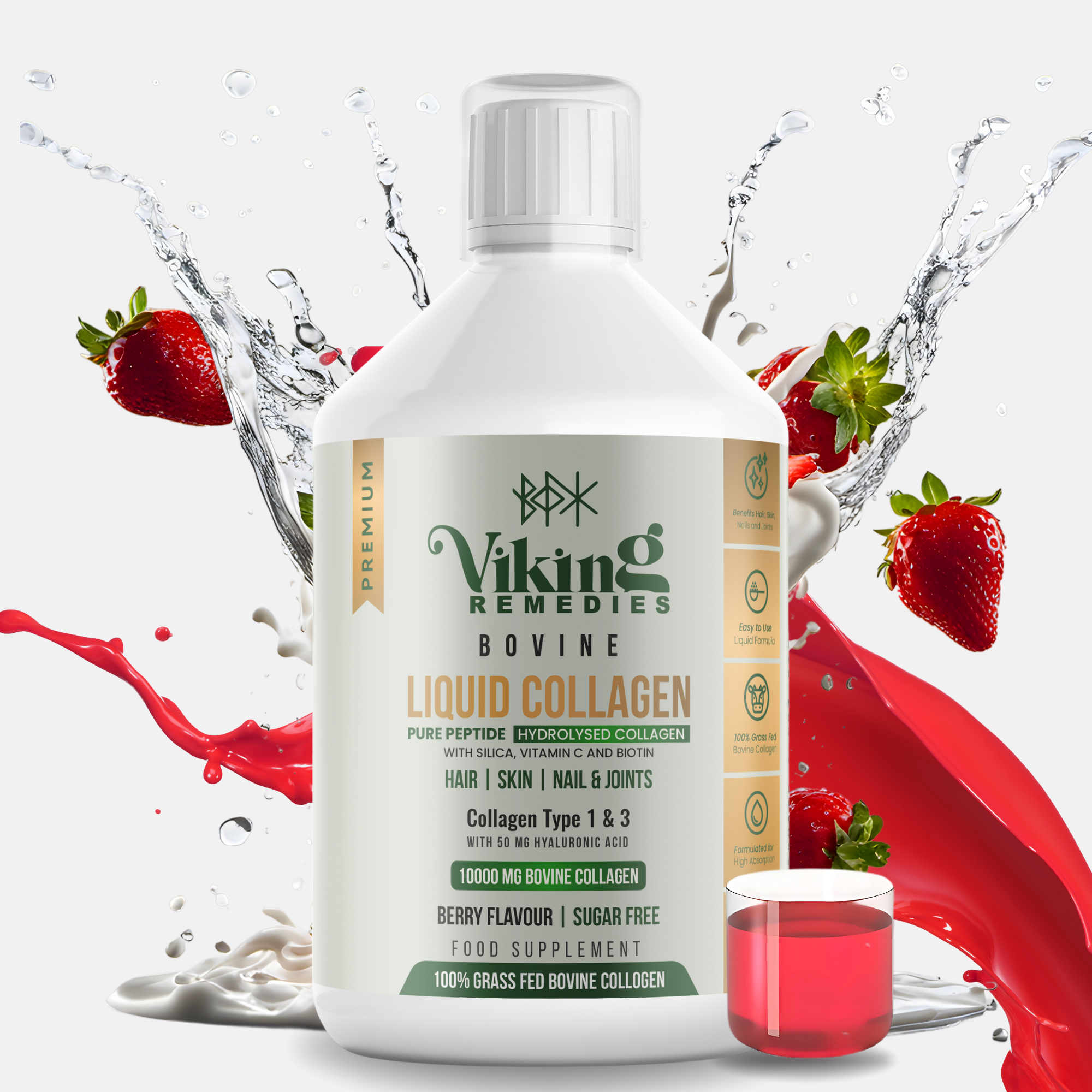 Viking Remedies Liquid Bovine Collagen is a delicious and convenient way to support your beauty and wellness. Each serving provides 10,000mg of hydrolysed bovine collagen (Types I & III), combined with key nutrients including Hyaluronic Acid, Vitamin C, Biotin, and Silica.